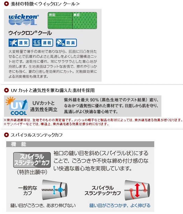 抜群の通気性と優れた吸水速乾性を備えたウイックロンクールを採用。大変涼しく、肌面をドライにキープするため、夏の炎天下でも快適。
