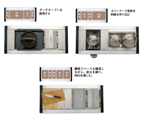 アイアングリルテーブルは調理スタイルに合わせて、様々なパーツをお好みでセットアップできるユニットシステムのテーブルです。4ユニットタイプは調理スペースを確保したゆとりのあるタイプです。