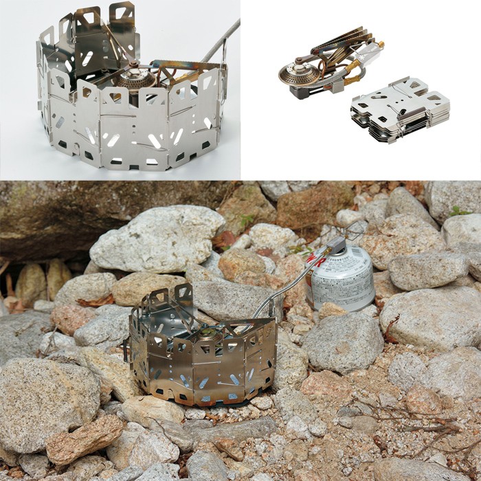 大きな風防が脚を兼ねていますので、たとえ不整地であってもガタつきが起こりにくく、安定したセッティングができます。本体の五徳を風防にセットするだけで簡単に組立て完了。設計に無駄が無く、シンプルな構造です。選べる2つの五徳高:鍋を使う場合は、より耐風性を高めるために五徳が風防に深く落ち込むパターンでセット。フライパンを使う場合は、風防と五徳がフラットになるようセットします。風防のワイヤーを解除すれば、パネルごとに小さく折り畳め、スマートなキャリングが可能です。