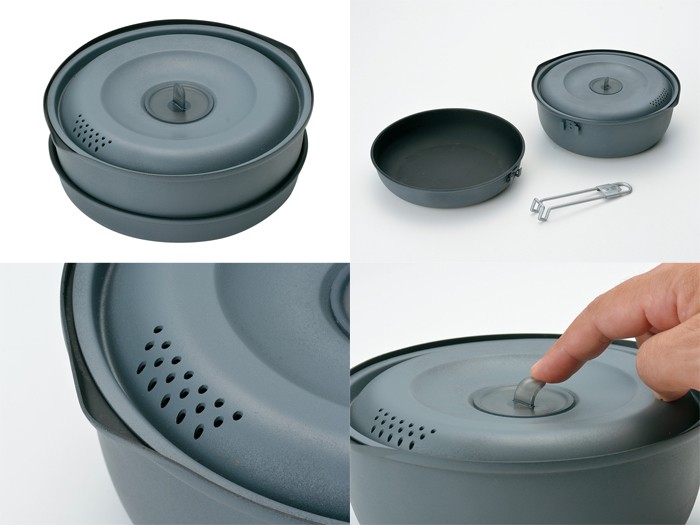 湯切り穴と注ぎ口:湯を切ったり注いだりする作業がしやすいデザインになっています。山岳調理には欠かせない機能です。ツマミは熱くなりにくいシリコーンゴム製です。指が鍋蓋に直接触れないように設計されていますので安心です。ハンドルは簡単に着脱ができる構造です。熱くなりにくく、軽いハンドルを目指し、シンプルな形状に仕上げました。フライパンはクッカーの底に収めることも蓋にすることもできます。調理器具を収納した際は、蓋としてご利用ください。