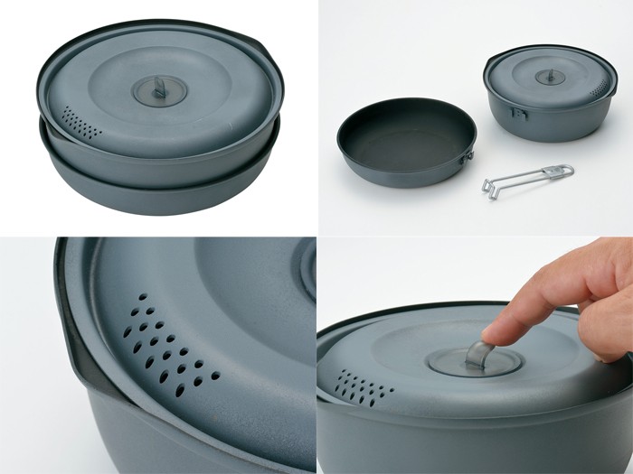 湯切り穴と注ぎ口:湯を切ったり注いだりする作業がしやすいデザインになっています。山岳調理には欠かせない機能です。ツマミは熱くなりにくいシリコーンゴム製です。指が鍋蓋に直接触れないように設計されていますので安心です。ハンドルは簡単に着脱ができる構造です。熱くなりにくく、軽いハンドルを目指し、シンプルな形状に仕上げました。フライパンはクッカーの底に収めることも蓋にすることもできます。調理器具を収納した際は、蓋としてご利用ください。