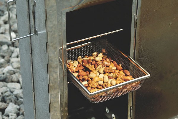 網から落ちる小さい物をスモークするのに便利なバスケット。スモークナッツに最適 小さいナッツ類をまんべんなくスモークするのに向いてます。